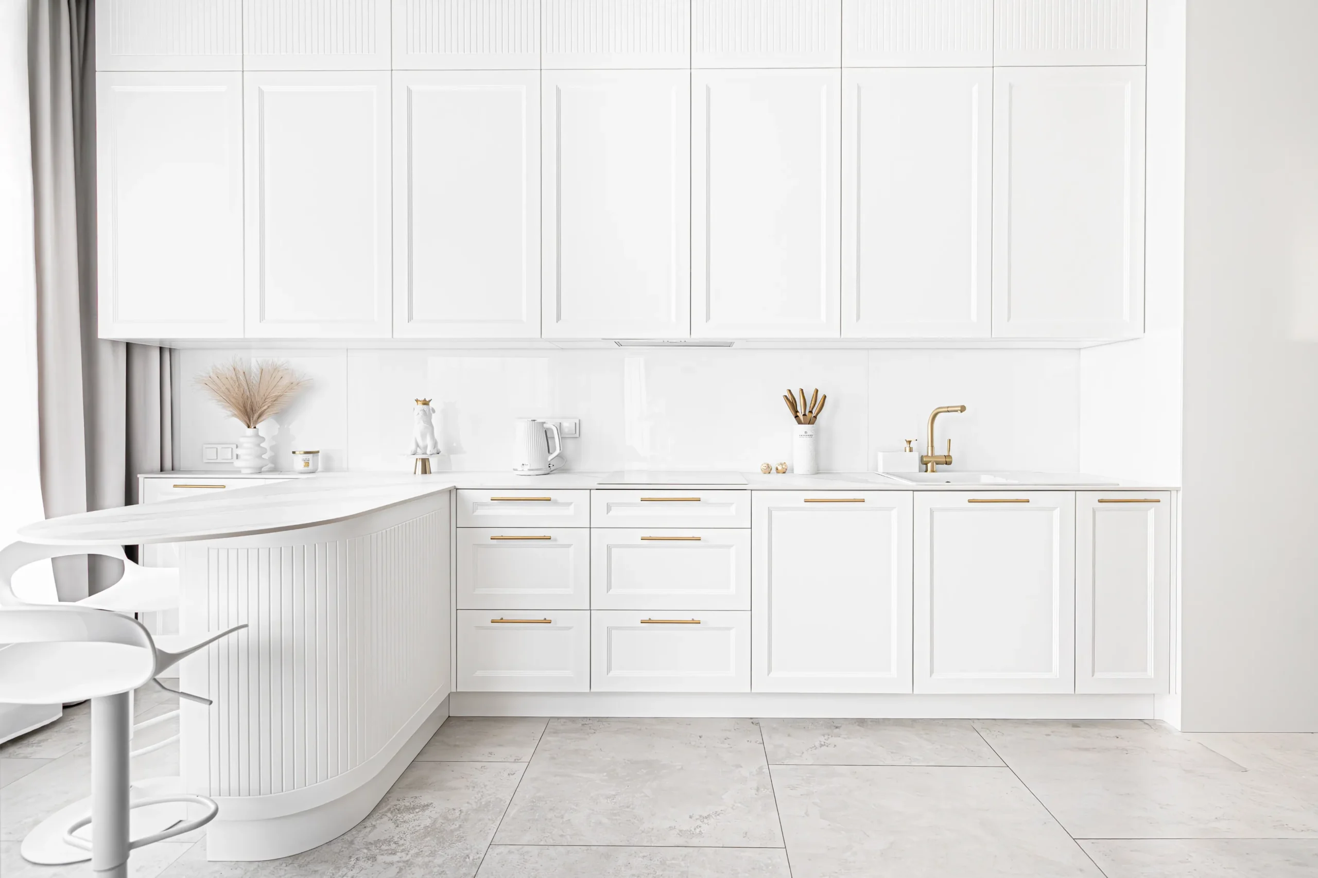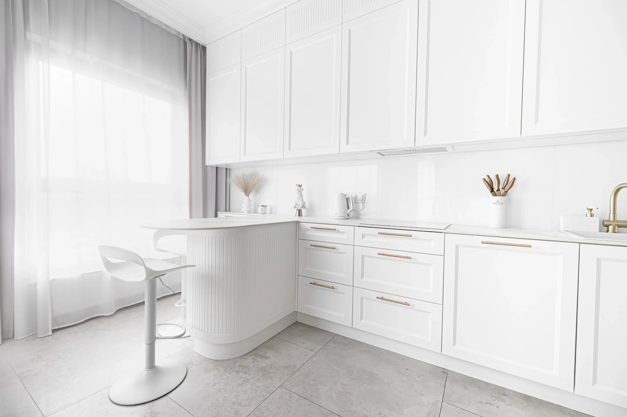 Idealne połączenie ze sztukaterią: Zastosowanie dedykowanych blend nad szafkami pozwoliło na perfekcyjne wyprowadzenie listew przysufitowych. Meble wyglądają, jakby dom został zbudowany wokół nich.