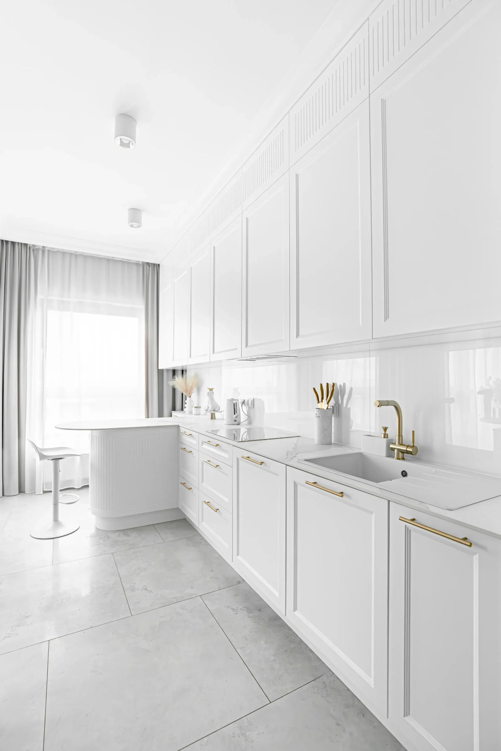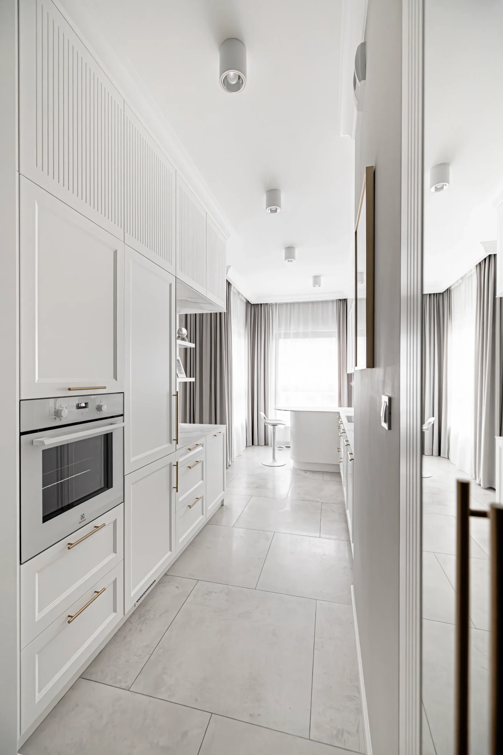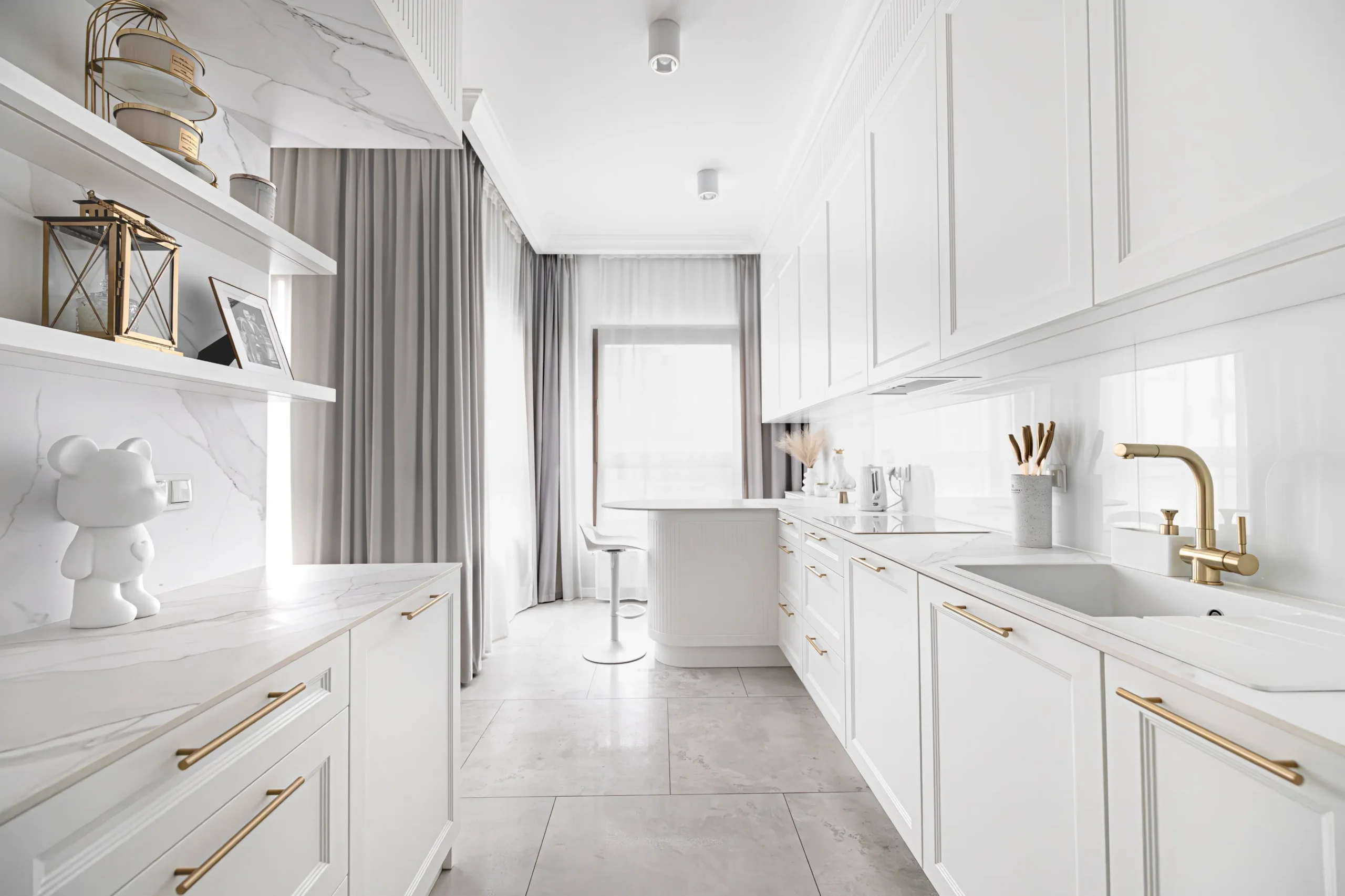 Elegancja: biała kuchnia ze złotymi dodatkami | apartament aktorki Agnieszki Mrozińskiej to harmonia i piękna forma