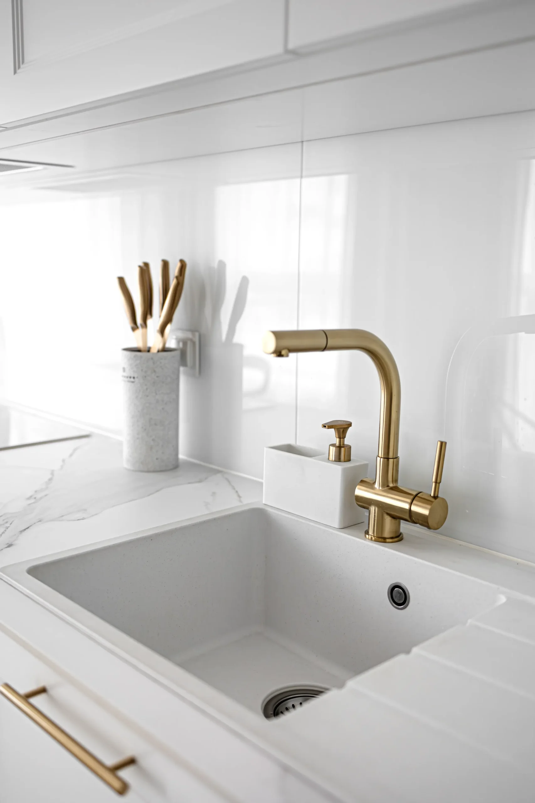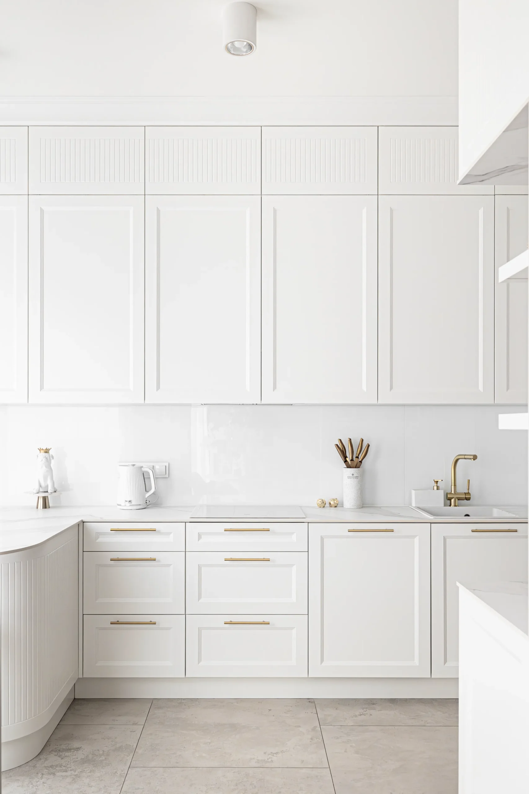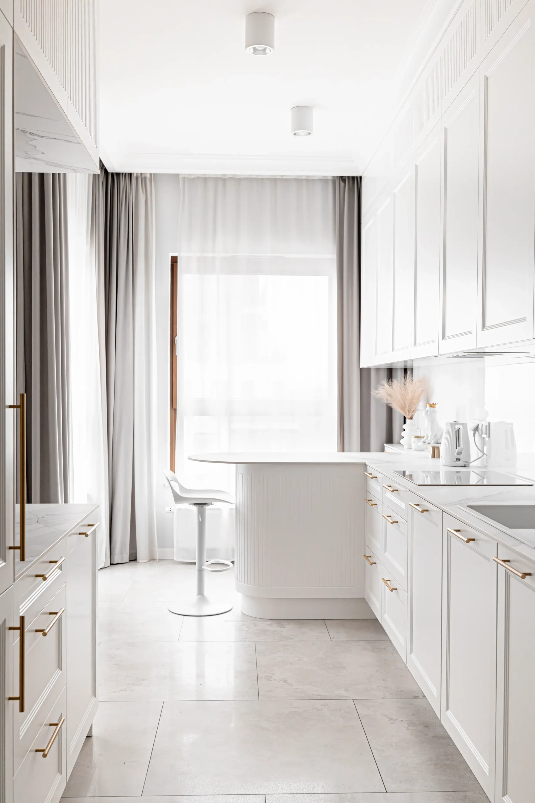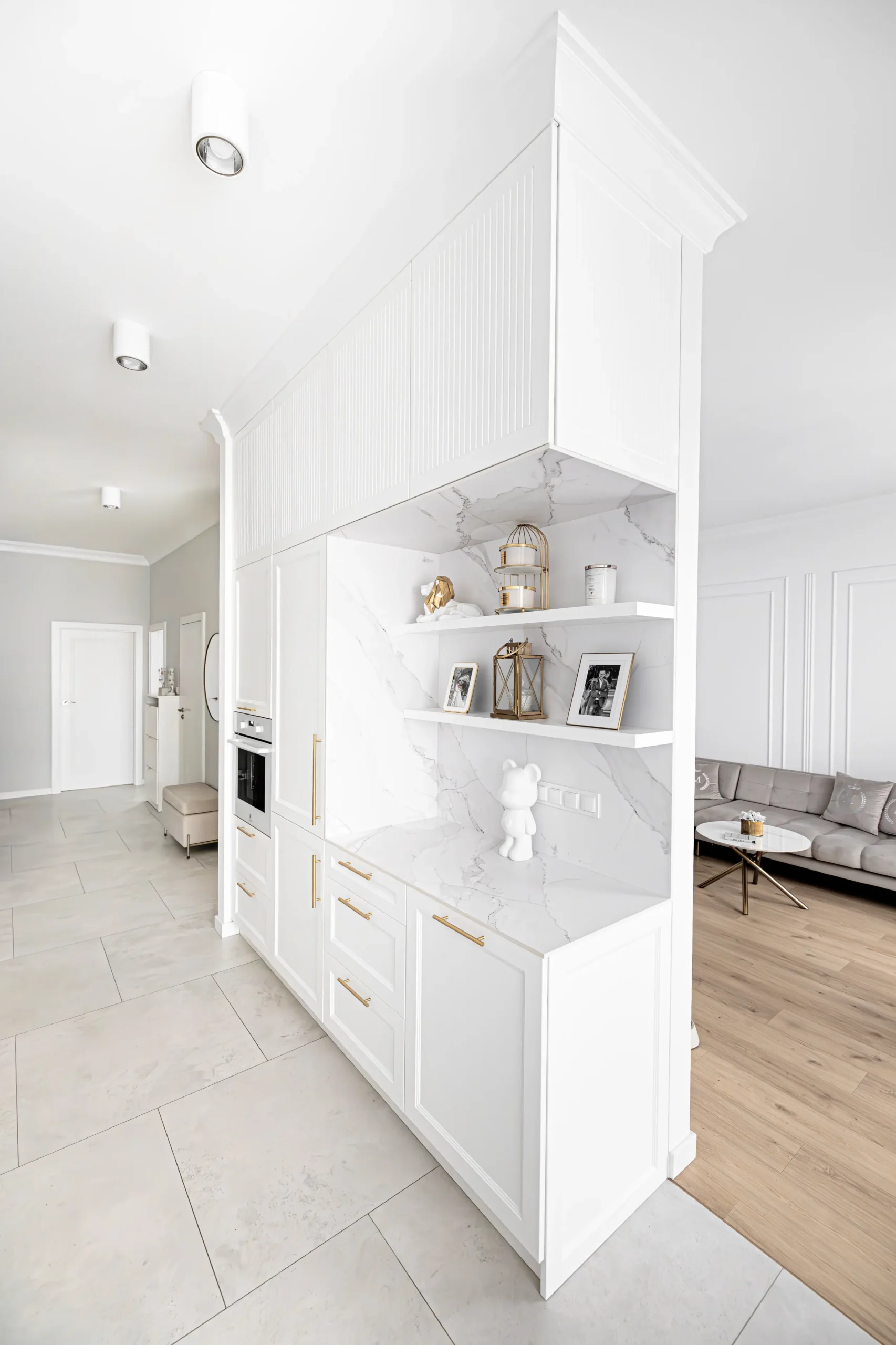 Elegancja: biała kuchnia ze złotymi dodatkami | apartament aktorki Agnieszki Mrozińskiej to harmonia i piękna forma