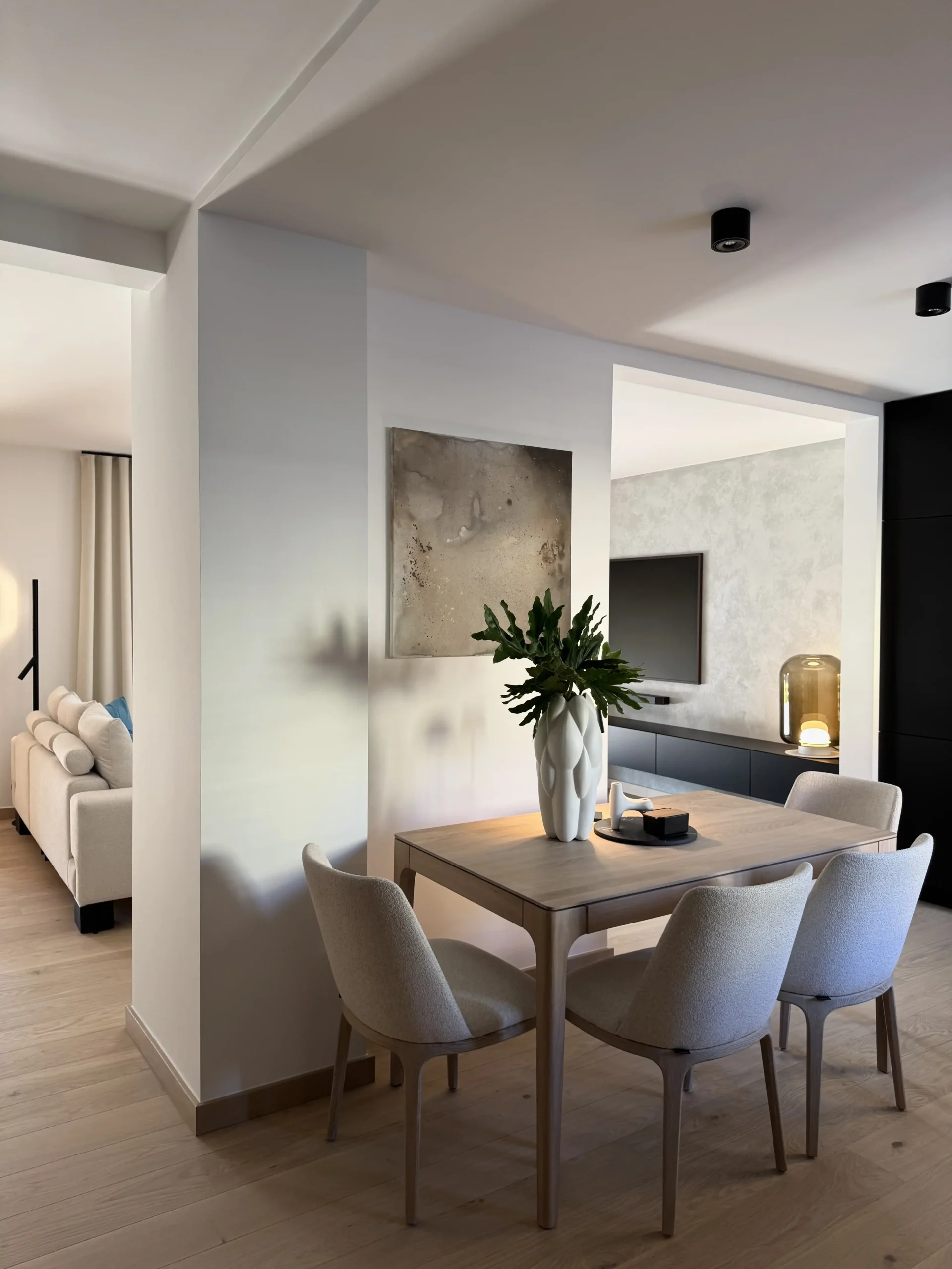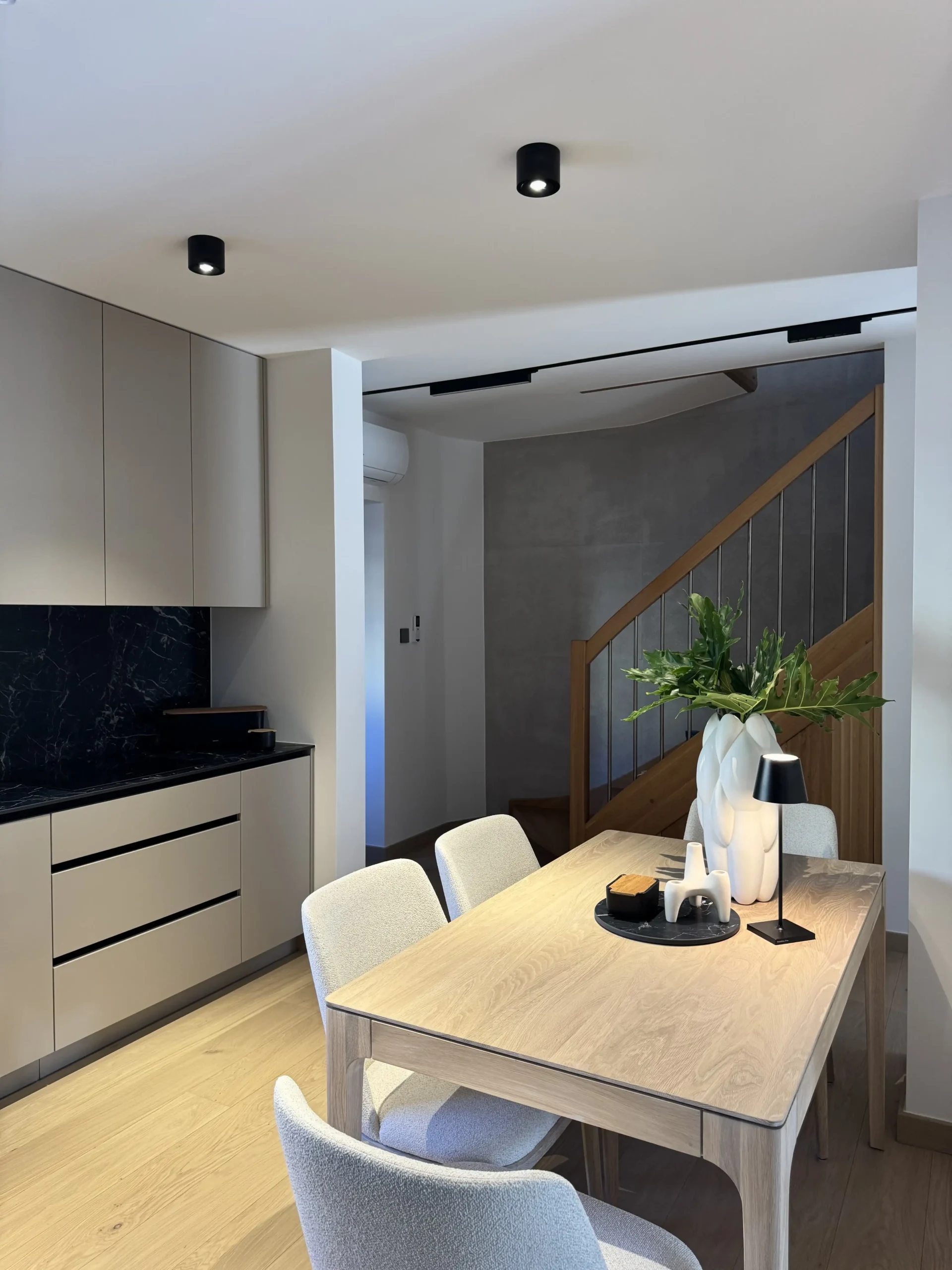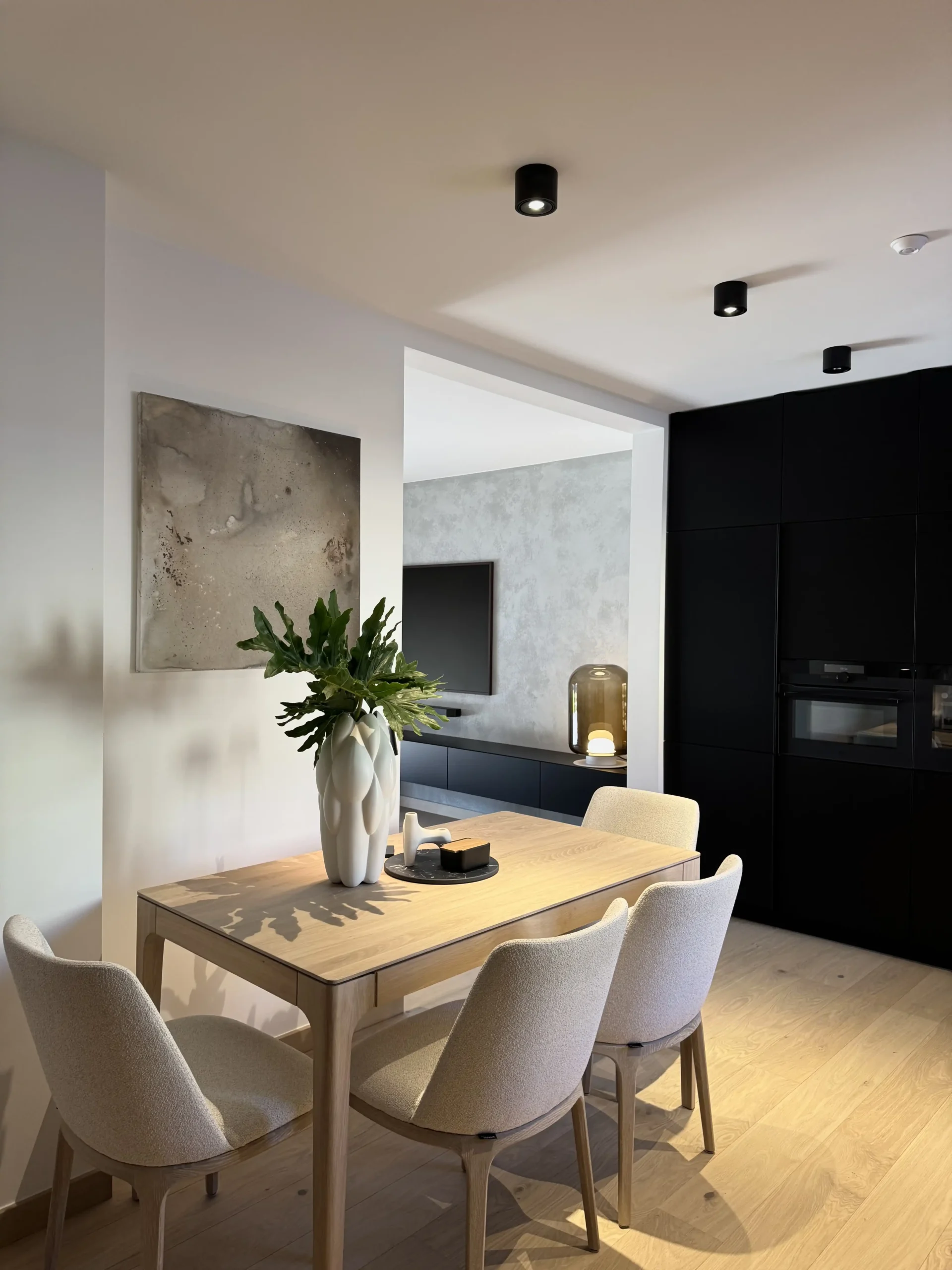 Strefa dzienna została zaaranżowana w pełnej harmonii z kuchnią – stół z jasnego drewna, krzesła tapicerowane w odcieniu écru, dekoracyjna lampa i ceramiczne dodatki nadają przestrzeni nowoczesnej elegancji. Drewniana podłoga i spójna kolorystyka tworzą atmosferę spokoju, idealną do codziennego życia i spotkań z bliskimi.