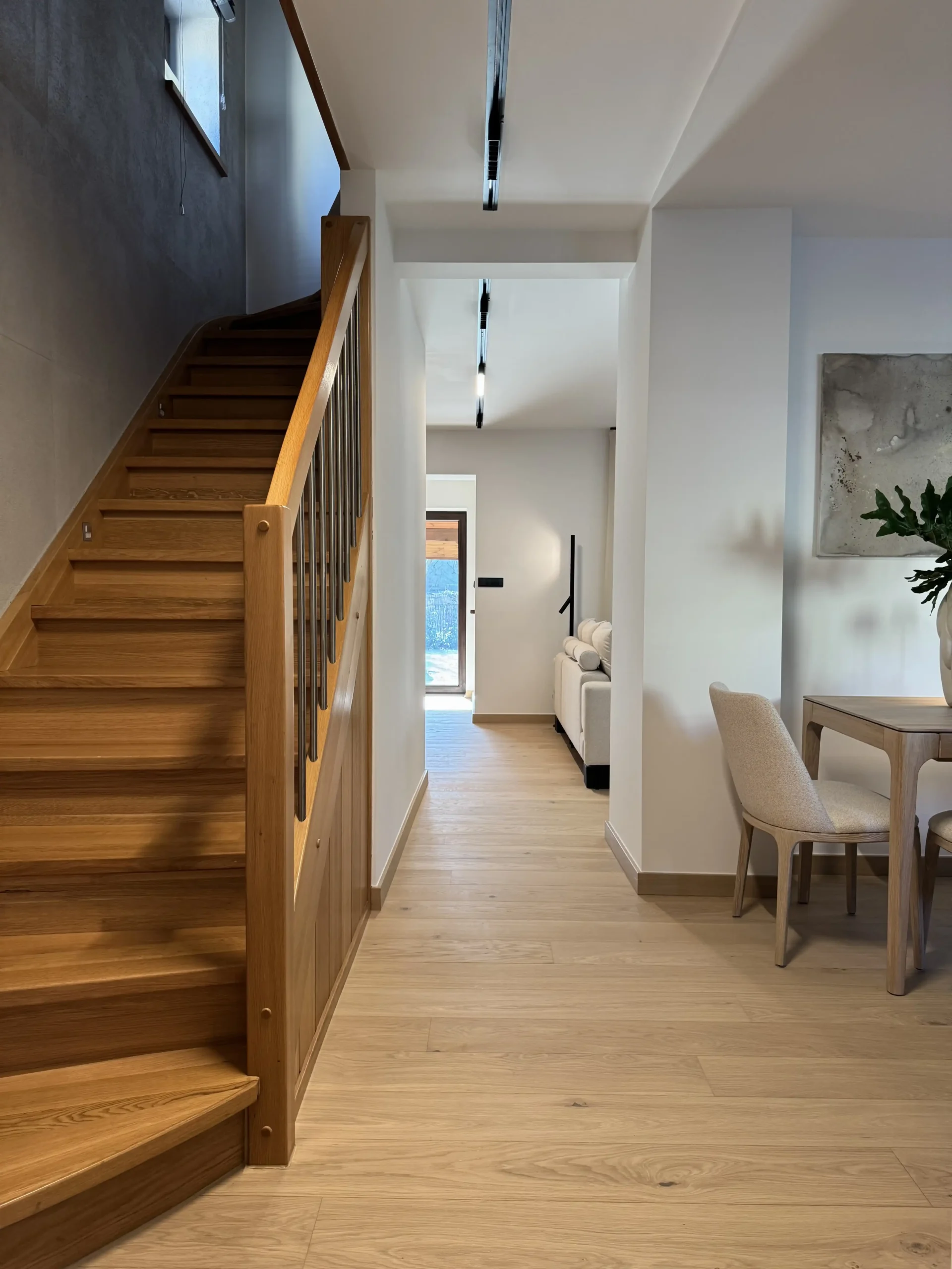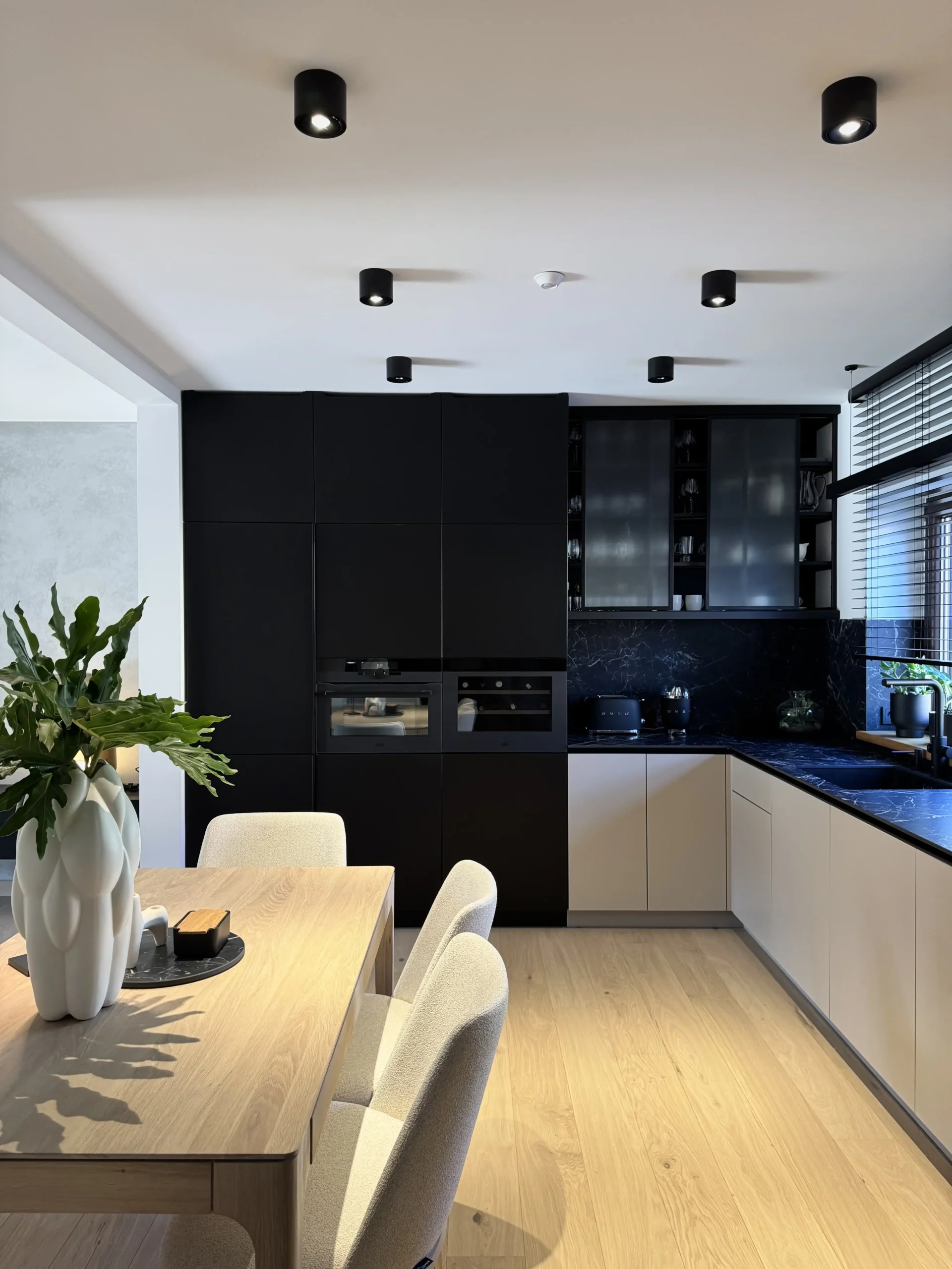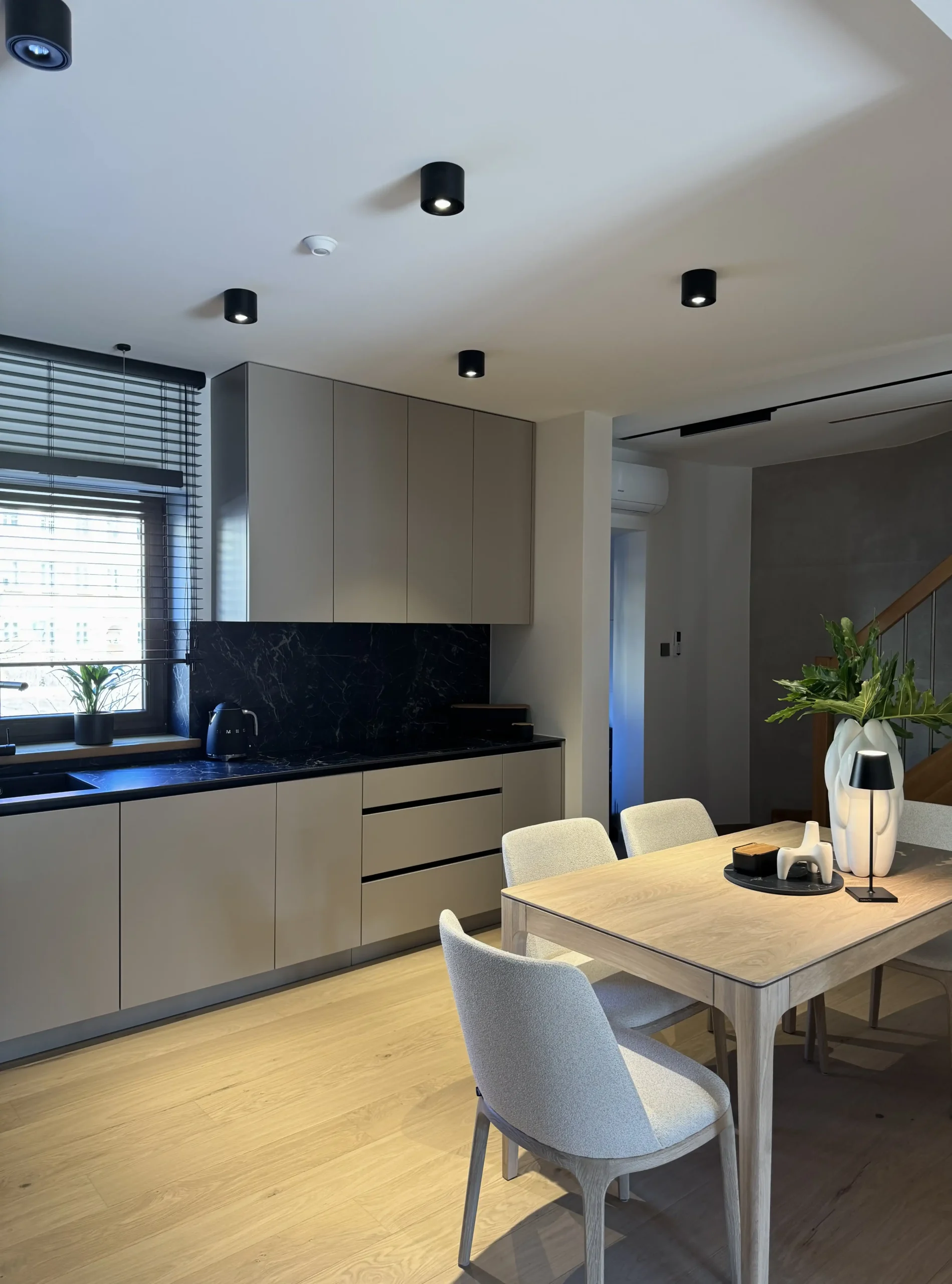 Strefa dzienna została zaaranżowana w pełnej harmonii z kuchnią – stół z jasnego drewna, krzesła tapicerowane w odcieniu écru, dekoracyjna lampa i ceramiczne dodatki nadają przestrzeni nowoczesnej elegancji. Drewniana podłoga i spójna kolorystyka tworzą atmosferę spokoju, idealną do codziennego życia i spotkań z bliskimi.