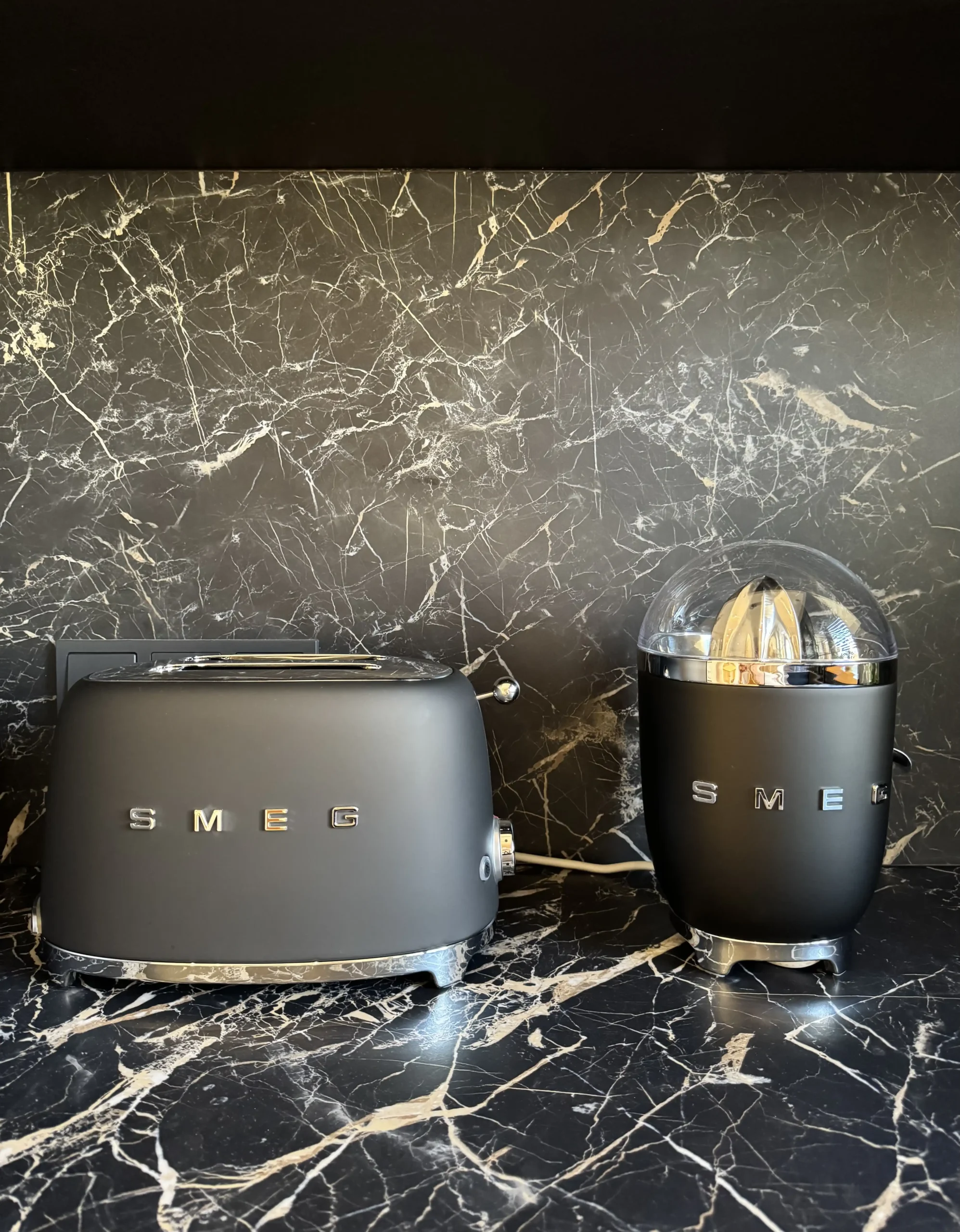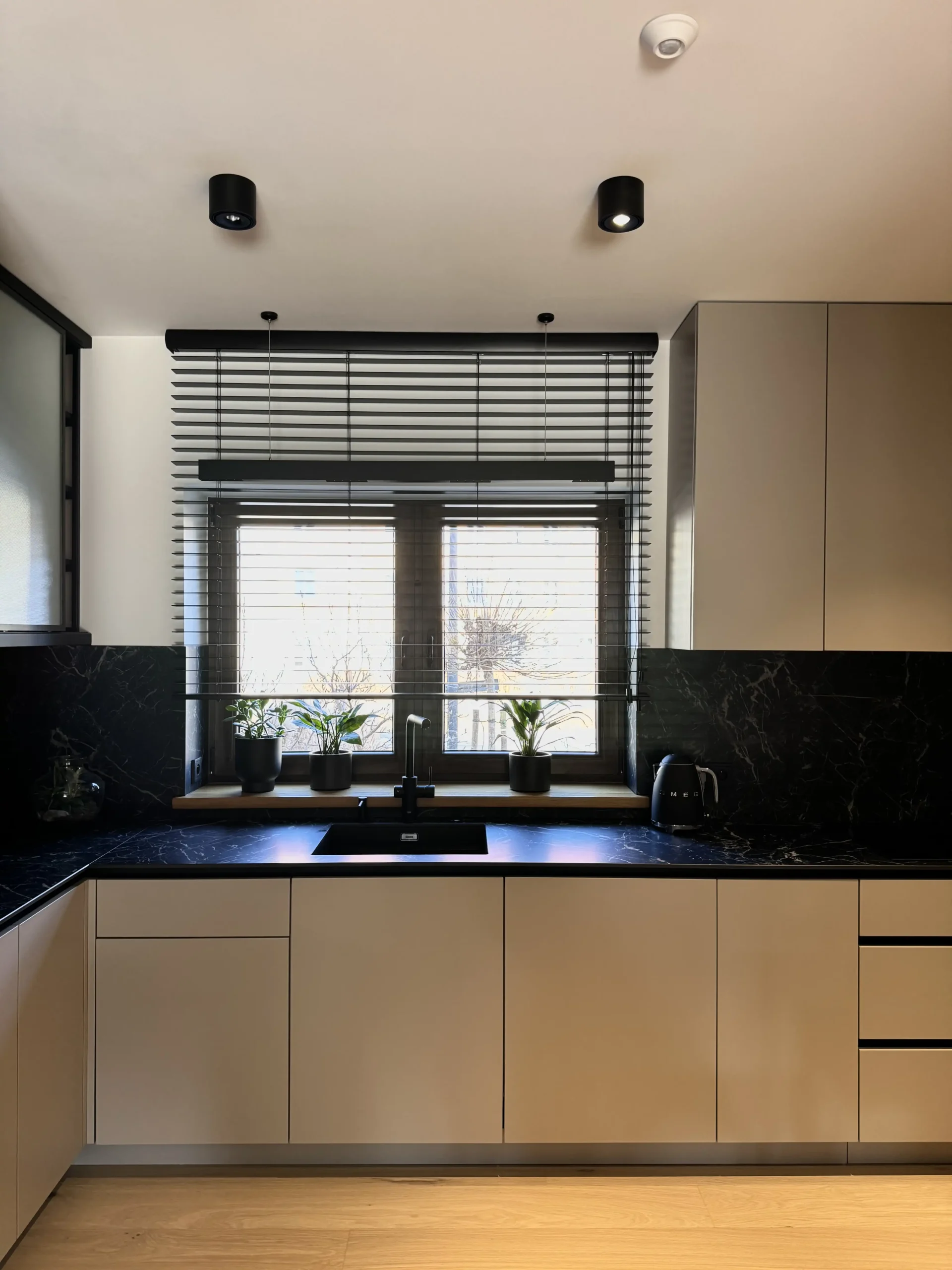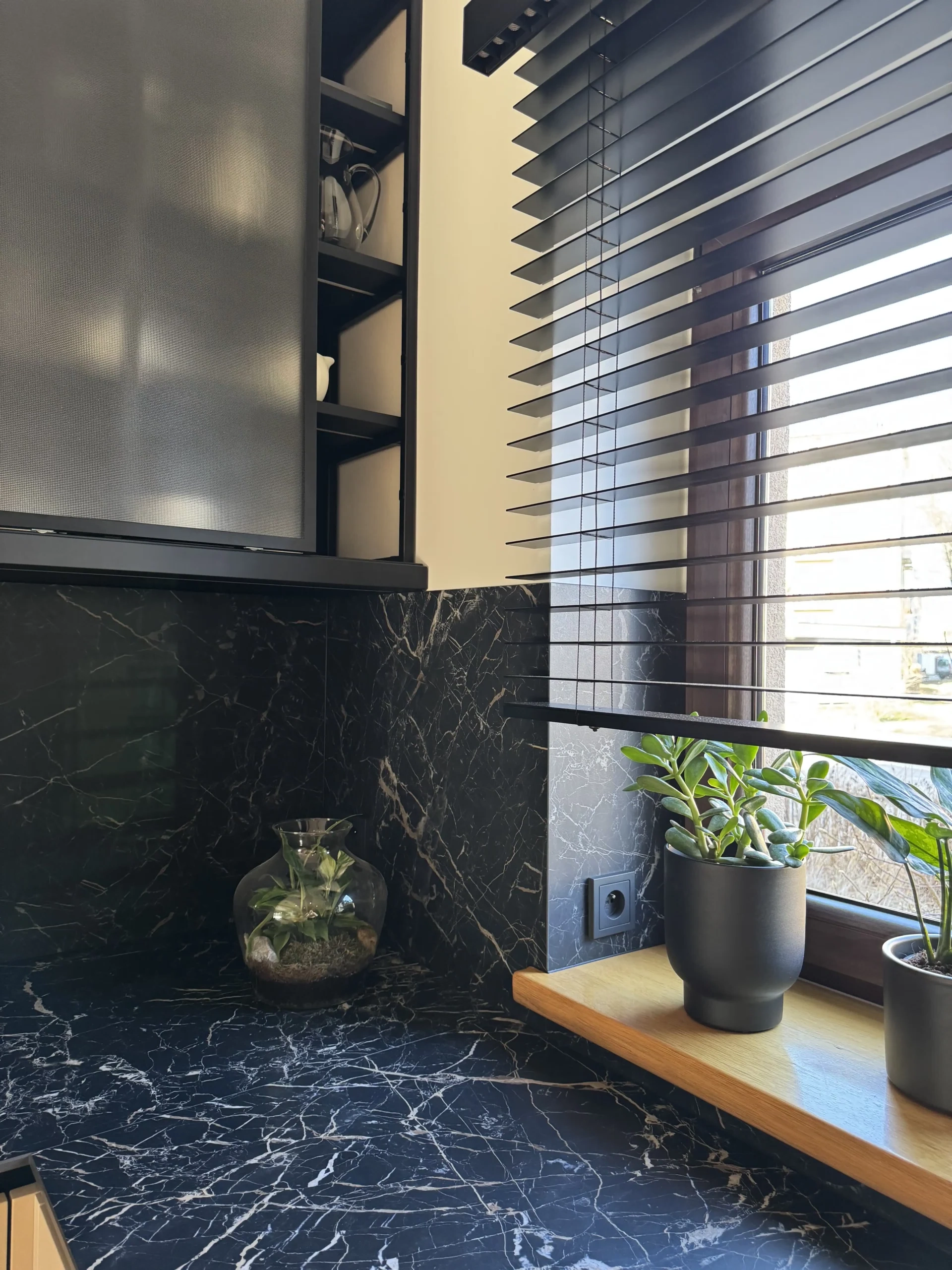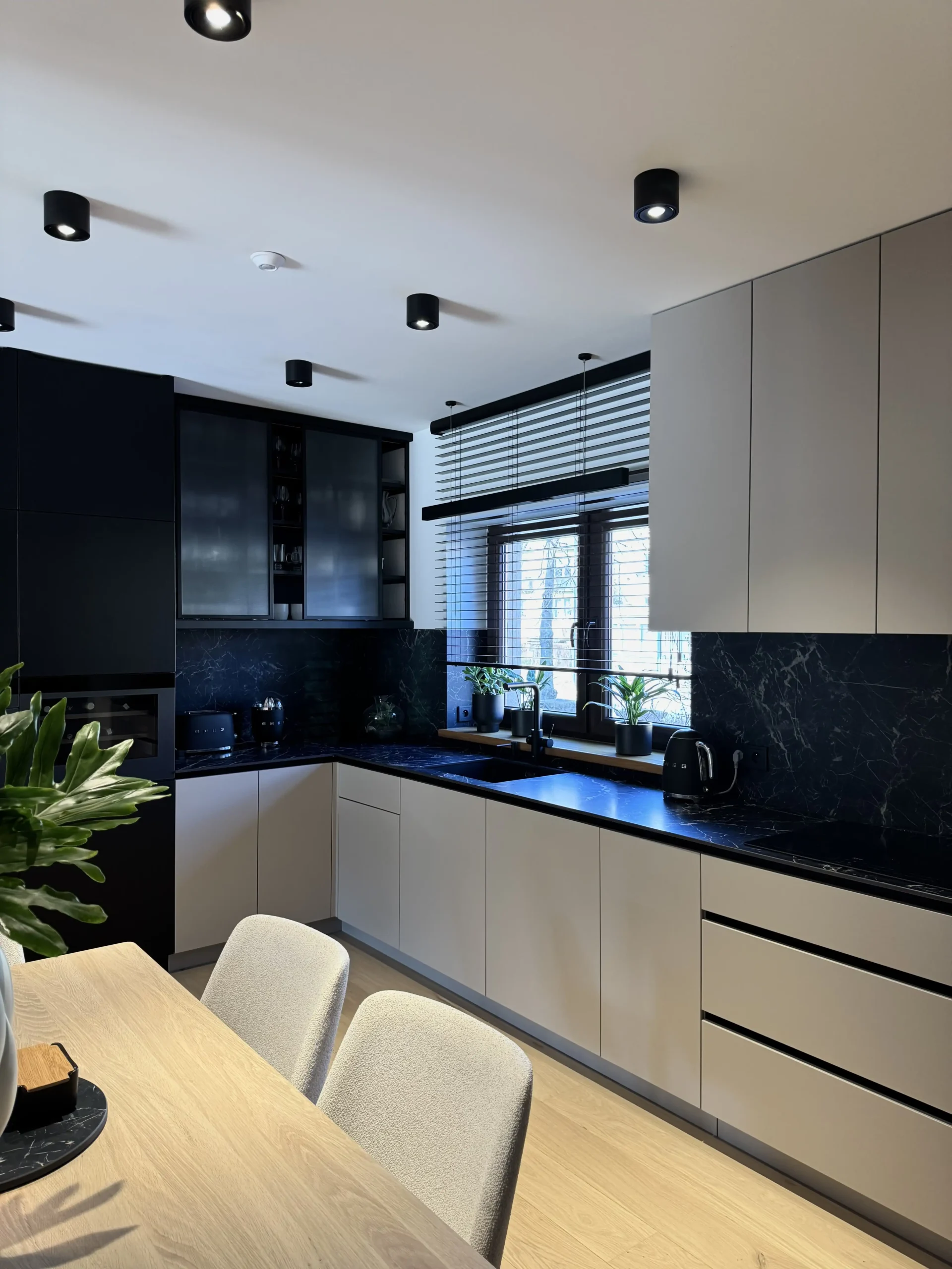- Głęboka czerń blatów ze spieku kwarcowego Marazzi Saint Laurent Satin wprowadza elegancję i kontrast do wnętrza.