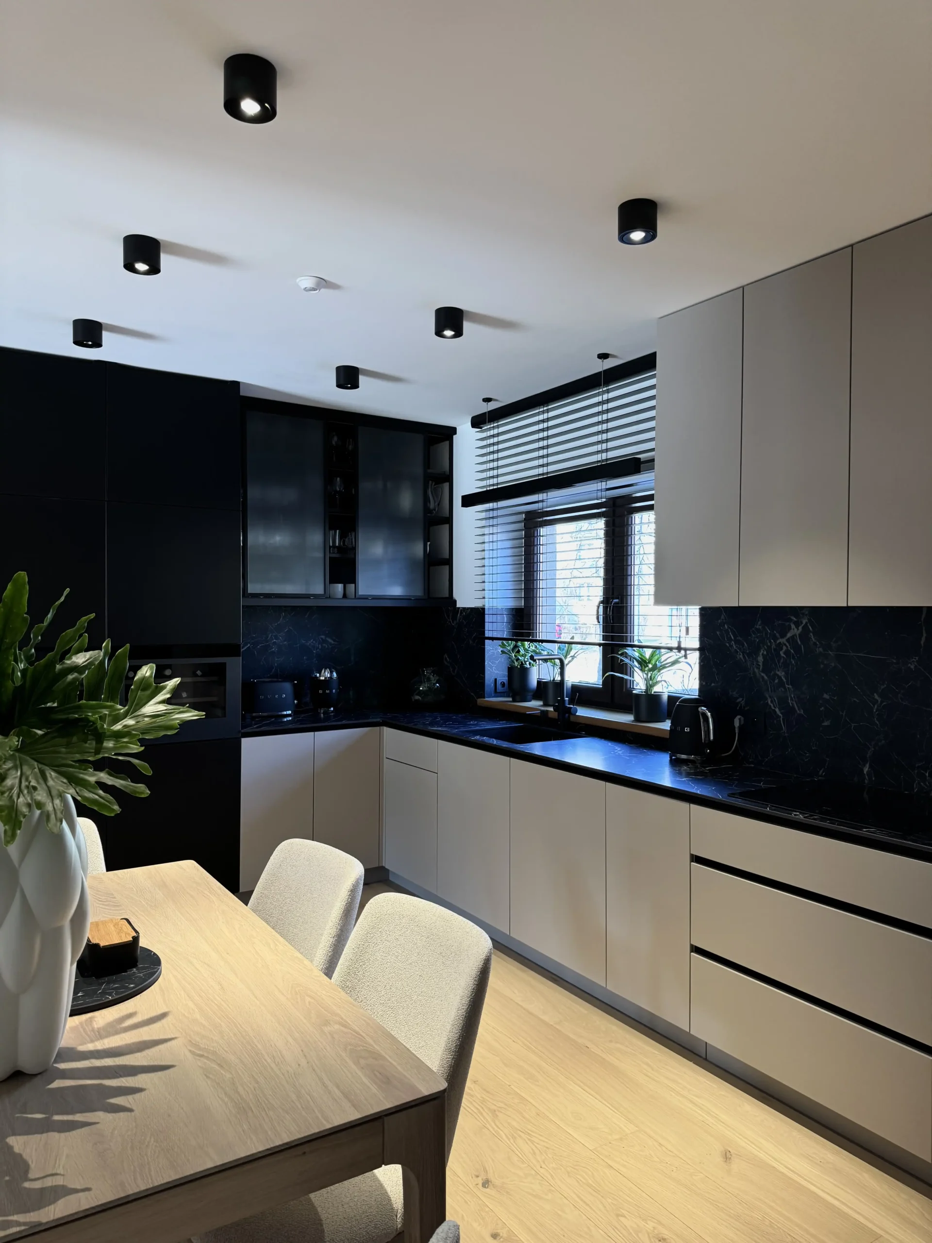 Prezentowana realizacja to harmonijne połączenie eleganckiej nowoczesności z subtelnym minimalizmem, gdzie nowoczesna kuchnia, zaprojektowana z dbałością o każdy detal, stanowi serce przestrzeni. Nowoczesna kuchnia, jako centralny punkt aranżacji, wyróżnia się przemyślanym układem, wysokiej klasy materiałami i funkcjonalnością dopasowaną do codziennych potrzeb domowników. Projekt bazuje na starannie dobranych materiałach, funkcjonalnym układzie wnętrza oraz indywidualnie zaprojektowanych elementach wyposażenia – zarówno w kuchni, jak i w otwartej strefie dziennej. Szczegółowy opis użytych materiałów, rozwiązań funkcjonalnych oraz informacje wykonawcze dostępne są pod zdjęciami.