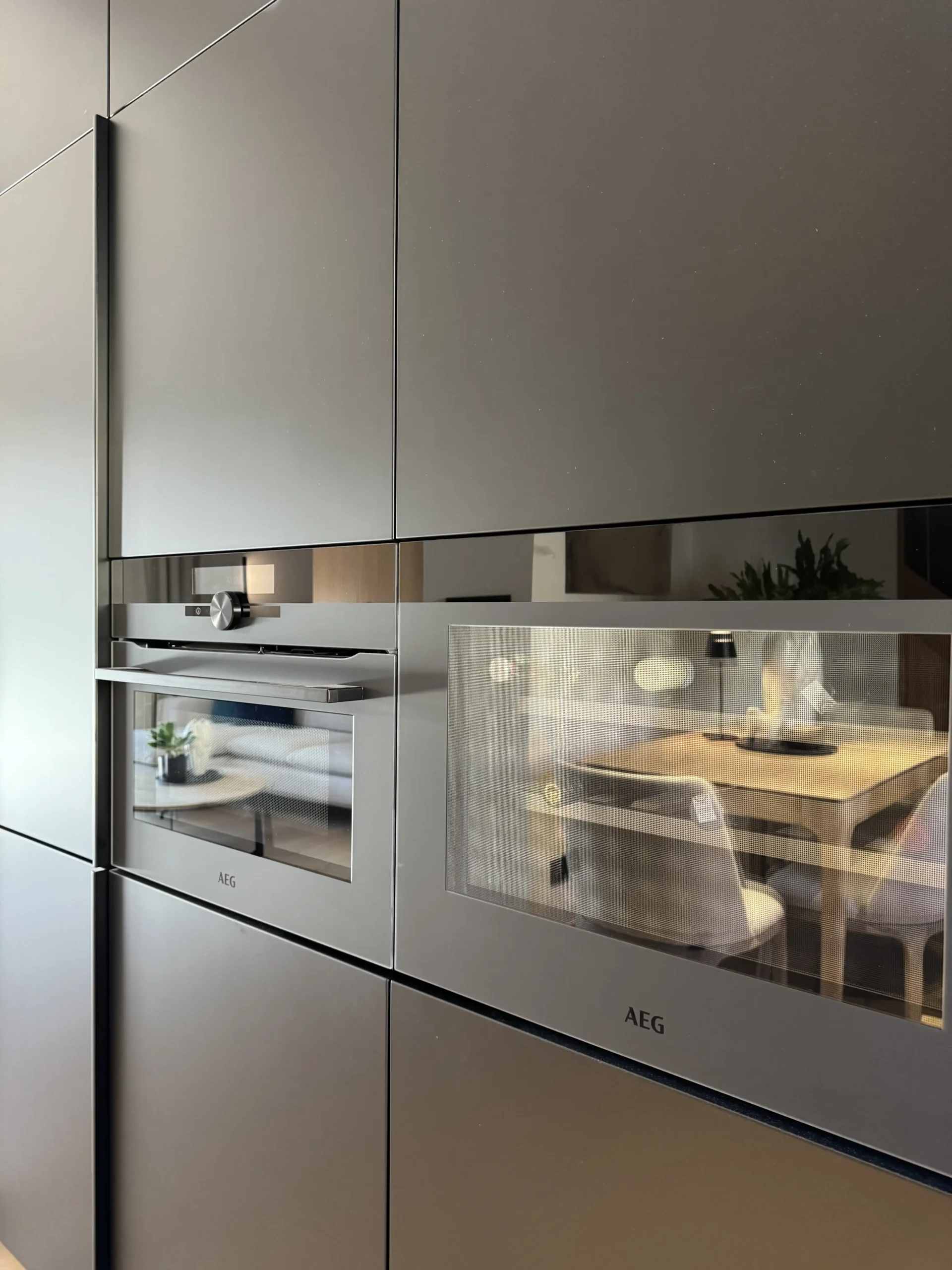 - Kuchnia: fronty i elementy lakierowane z powłoką S-MAT, regał z podświetleniem i szkłem ornamentowym w ramach przesuwnych, blaty – spiek Marazzi Saint Laurent Satin, bateria GROHE BLUE HOME z funkcją gazowania wody.